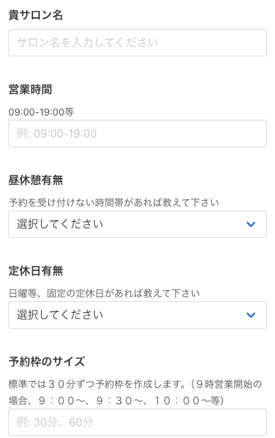 ※一人サロン・個人サロン以外の方はこのフォームの内容ではご要望を十分に伝えきれないと思いますが、その場合は個別にメッセージを頂いて対応させて頂きます。(従来通り)