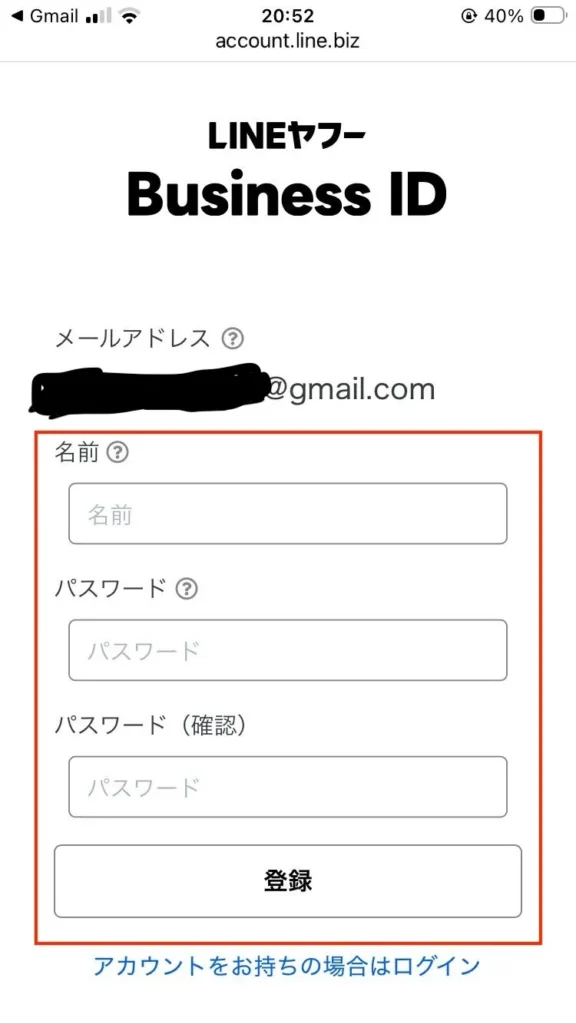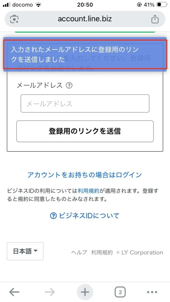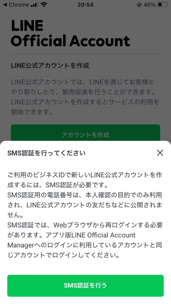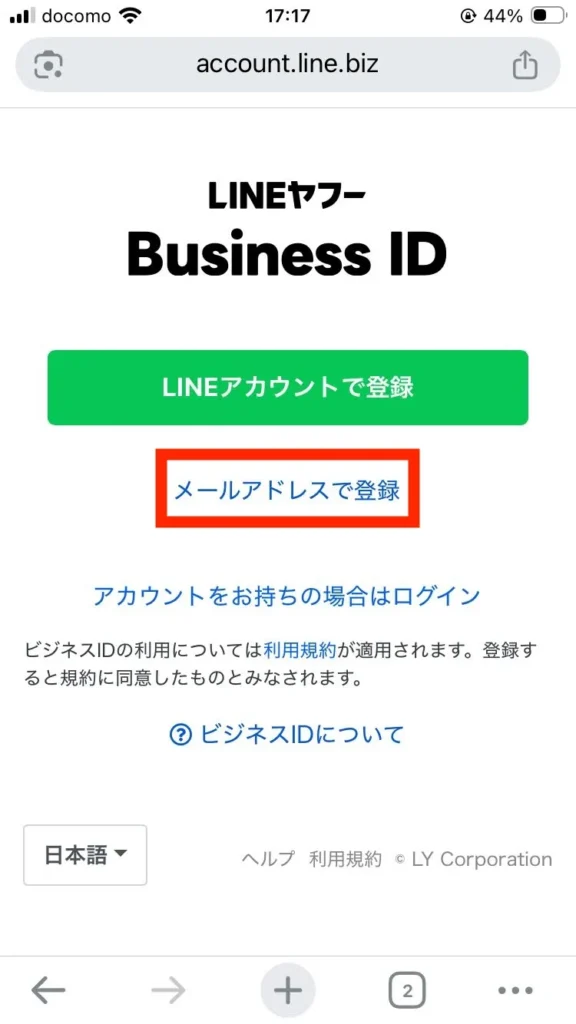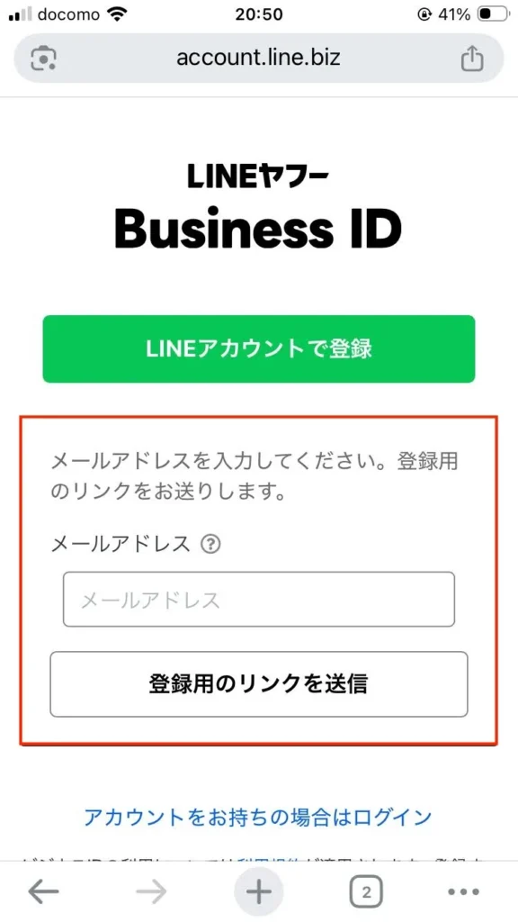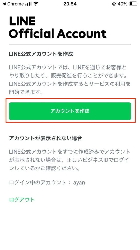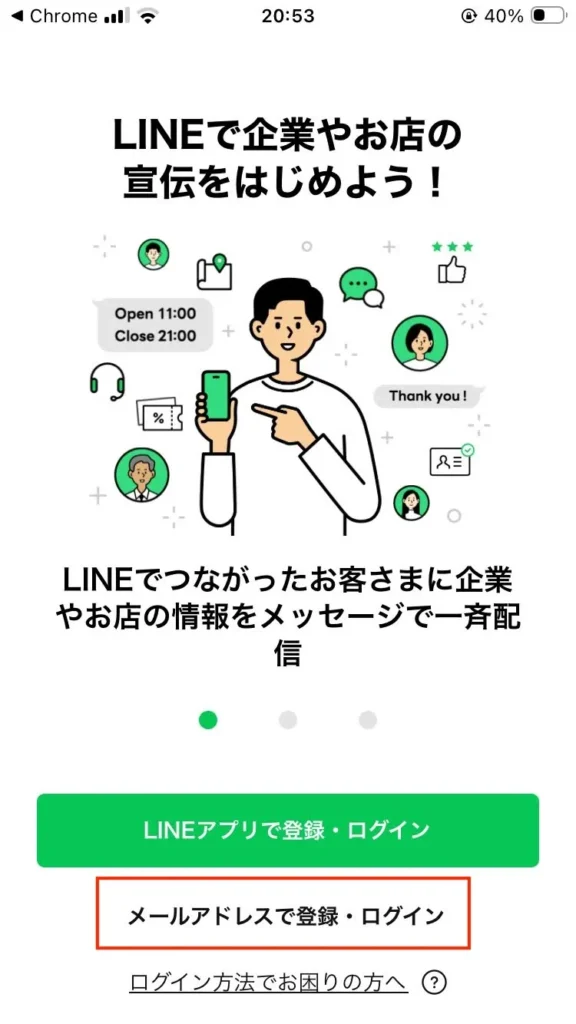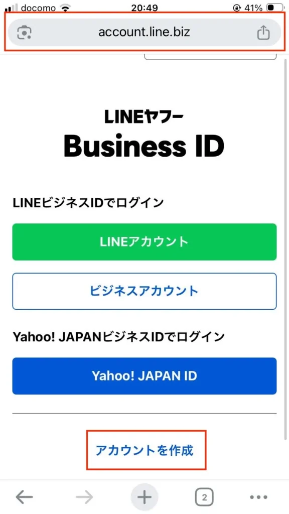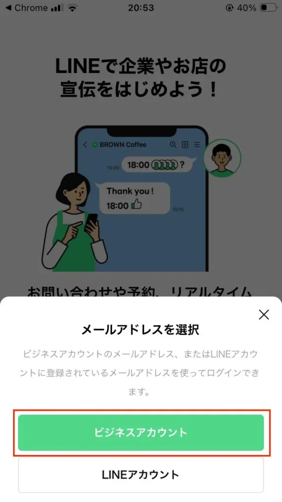 2.インストール完了後、LINEでログインではなくビジネスアカウントを作るためChromeやSafariなどのブラウザアプリで以下を開いてください。